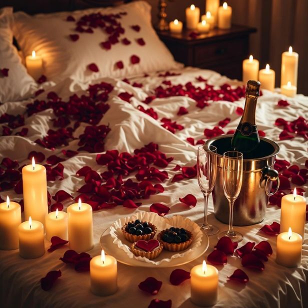 Центром этой картины станет роскошная кровать, украшенная живыми лепестками алых роз. Искристый комплимент: Охлаждённая бутылка изысканного шампанского (или игристого вина) с двумя бокалами станет прекрасным началом праздника.